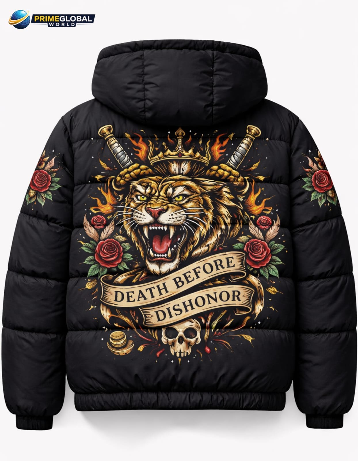 Jacket ke back side par bada tiger (baagh) tattoo design bana hua hai.