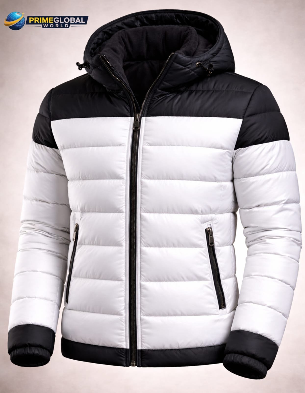 This jacket has a two-tone color style: white and black.