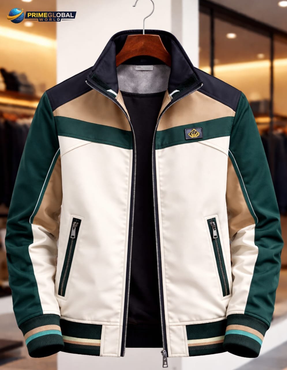 Cuffs & Hem: Ribbed cuffs aur bottom hem navy blue stripes ke sath jo jacket ko sporty look dete hain.
